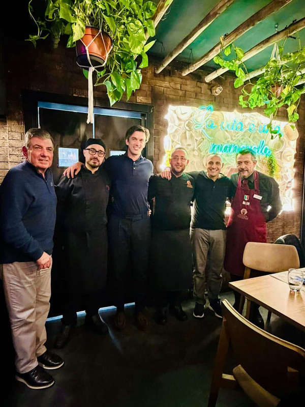 Il Presidente del Napoli Basket Matt Rizzetta, il general manager James Laughlin ed i loro ospiti festeggiano la vittoria contro Varese da Ostaria Pignatelli Prive. Ecco la foto con lo chef e lo staff del ristorante inviata a "Napoli Magazine".